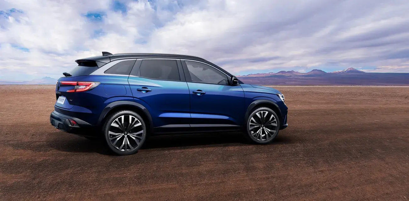De nieuwe Renault Austral 100% hybride SUV heeft perfecte afmetingen, een krachtige voorkant en opvallende verlichting. De stijlvolle lijnen worden benadrukt door het glanzend zwarte dak. De contrasterende beschermingselementen aan de zijkant versterken het robuuste profiel.